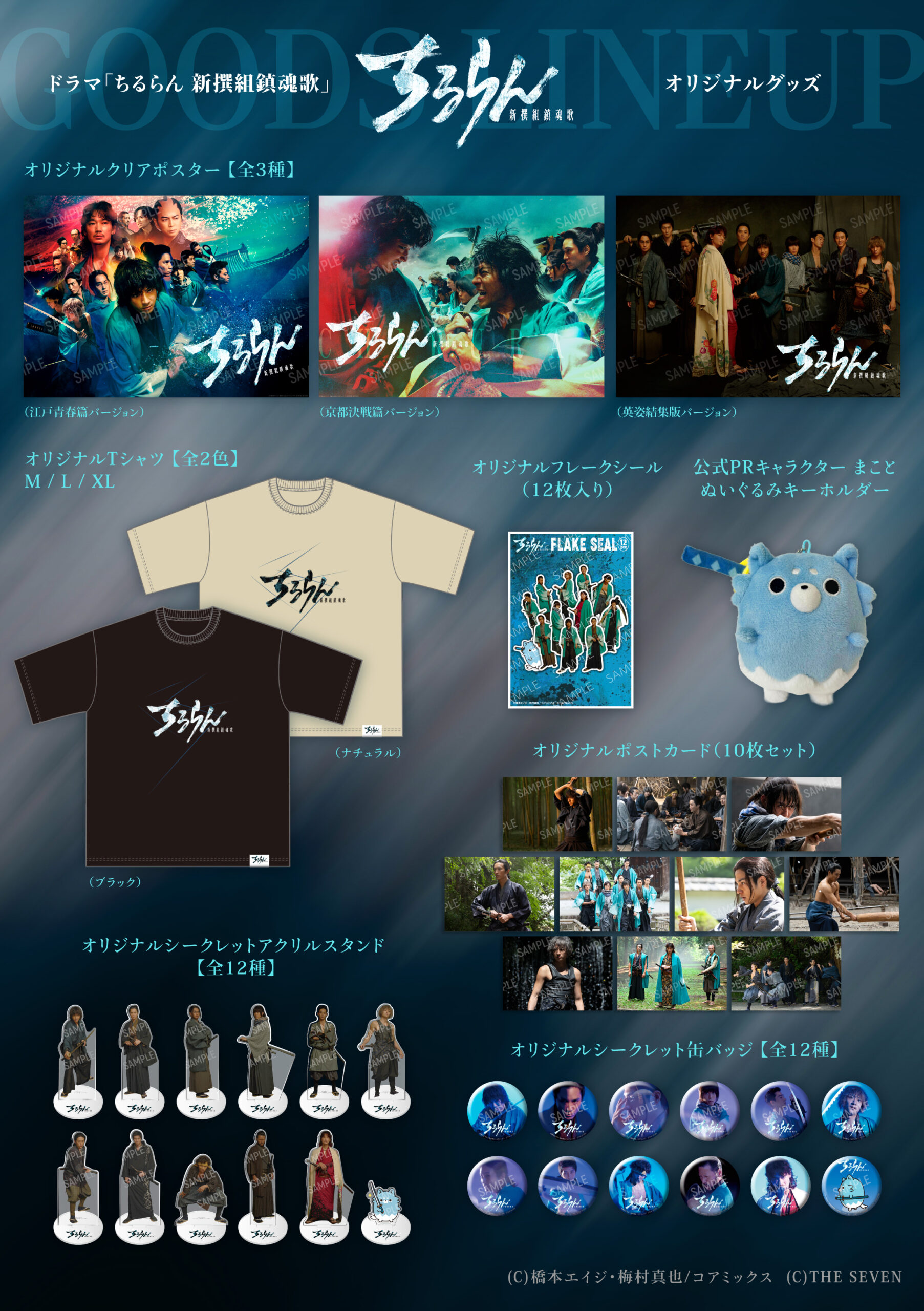 ドラマキャラクターの英姿を切り取った多彩なアイテムをはじめ、作品の世界観を象徴する刀痕(とうこん)デザインTシャツ、さらに公式PRキャラクター まこと のぬいぐるみキーホルダーまで、豊富なラインナップをご用意しました。